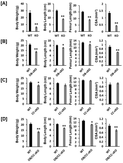 3.1. Bone Size at the Epiphysis Is Reduced in Mice with Global and Osteoblastic-Specific Disruption of the Igf-I Gene but Not in Chondrocyte-Specific Conditional KO Mice