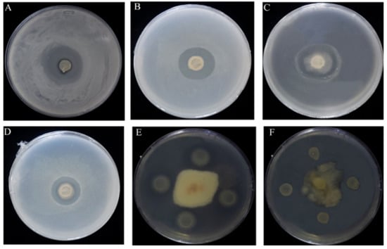 Strain ME9 antibacterial spectrum test results (A) Xanthomonas phaseoli pv. Manihotis 11; (B) Xanthomonas phaseoli pv. Manihotis 1; (C) Escherichia coil; (D) Staphylococcus aureus; (E) Colletotrichum gloeosporioides1901 (Hevea brasiliensis); (F) Colletotrichum gloeosporioides W2 (Stylosanthes guianensias).