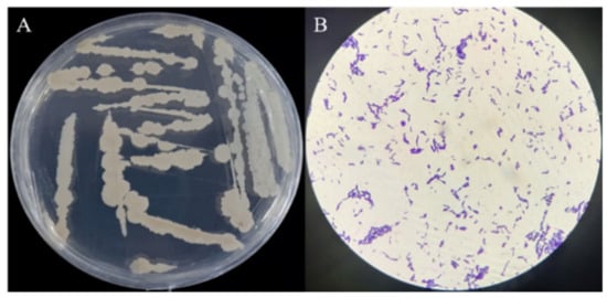 Based on morphological characteristics [37], the bacterial strain with the strongest antagonistic activity against cassava bacterial blight was inoculated on an LB plate at 28 °C. Gram staining was carried out after inoculating for 18–24 h. Under the microscope, Gram staining and cell morphology were observed and photographed.