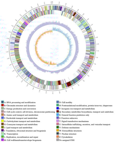 The putative genes were annotated for functional classification against databases according to Diamond [49], using the KEGG (Kyoto Encyclopedia of Genes and Genomes) and the GO (Gene Ontology) database, with an e-value of 1 × 10−5. A genome overview was created using Circos (v0.69) [50] to show annotation information.