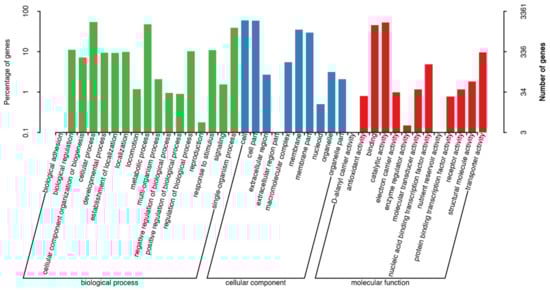 Therefore, it was important to perform the genome annotation of strain ME9. In strain ME9, 3,361 genes were annotated in the GO database, and these were mainly divided into molecular functions (red), cellular components (blue) and biological processes (green). Parts of cell components totaled 10 types of functional genes, while cell and cell part genes accounted for more. There were 11 types of genes in the catalytic function classification, and the number of genes related to catalytic activity and binding was higher. Sixteen types of genes were annotated for the functions of biological processes, with a relatively high proportion of the genes involved in metabolic and cellular processes (Figure 5).