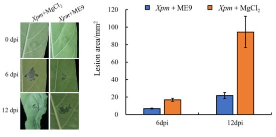 For spray assays, cassava plants at 30 d after planting (DAPs) were foliar-sprayed with 5 mL of the ME9 suspension. Two days later, Xpm11 and MgCl2 (negative control) were injected by syringe, and each split leaf had two injection ports on different sides, with Xpm11 on the right and MgCl2 on the left (control) [53]. The experimental design was completely randomized and two treatments were set, each consisting of 10 replications. After evaluating the disease incidence in hosts at 6, 9 and 12 d post inoculation with the pathogen, ImageJ was used to obtain the total area (TA) and affected area (AA) per leaf [54,55].