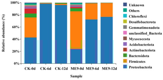 Composition of bacterial community based on phylum level between different treatments. Note: different colors represent the community structure distribution treated with ME9 (or not) after 0, 6 and 12d.