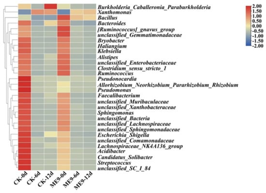 From the endophytic bacterial taxonomic analysis at the phylum level, the relative abundances of the 10 most abundant phyla (>1% of relative abundance in at least one sample) are shown in Figure 8. The endophytic bacterial flora of cassava leaves was mainly composed of Proteobacteria and Firmicutes. The abundance of Proteobacteria was 24.08% at 0 d, 72.35% at 6 d and 76.63% at 12 d. In the control group, the abundance of Proteobacteria was 42.74% at 0 d, 98.64% at 6 d and 96.06% at 12 d. The abundance of Proteobacteria showed an increasing trend as time went by in both the treatment and control samples. The abundance of Firmicutes was 66.16% at 0 d, 26.31% at 6 d and 22.69% at 12 d, and the abundance gradually decreased with the extension of the inoculation time. In the control group, the abundance of Firmicutes was 32.96% at 0 d, 0.96% at 6 d and 1.98% at 12 d. In the early stage of inoculation, the abundance showed a significant decrease. When comparing the same inoculation period, at 0 d of inoculation, the abundance of Proteobacteria was higher in the control group, while that of Firmicutes was greater with ME9 spraying. After 6 and 12 d of inoculation, the same trend was seen, with more Proteobacteria being found in the control group and the abundance of Firmicutes higher after spraying with ME9. These results indicated that ME9 application greatly affected the community structure of endophytic bacteria in the leaves and changed the abundance composition of each phylum.