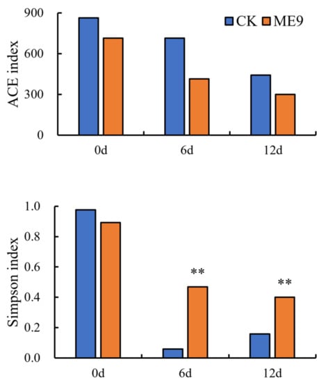 The population of bacteria, the bacterial richness (ACE) and the bacterial Simpson index were used to estimate the abundance and α-diversity of endophytic microbiomes, and a statistical analysis was performed using either with or without ME9 spraying as explanatory variables. The α-diversity of endophytic bacteria in cassava leaves was analyzed (Figure 10), where the ACE represented the abundance of the endophytic bacteria community, while the Simpson index represented both the abundance and evenness of the endophytic bacteria colony. The results showed that after ME9 spraying, the ACE index of endophytic bacteria in cassava leaves decreased compared with the control group, and gradually decreased with the extension of time, indicating that ME9 spraying can reduce the abundance of endophytic bacteria in cassava leaves. The Simpson index of the treatment group was lower than that of the control group only in the early stage, and it was significantly higher than that of the control group at 6 and 12 d of spray treatment, indicating that ME9 treatment could make the community structure of cassava endophytic bacteria more uniform.
