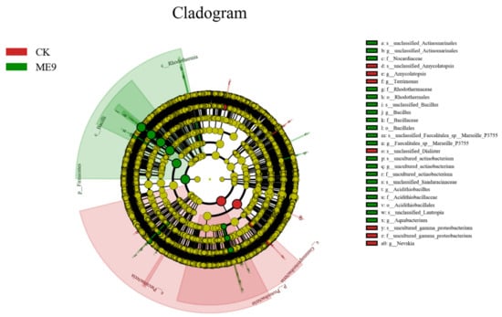 LEfSe of bacteria with significant differences among different treatments (yellow: the species with no significant differences; green: characteristic strains of the experimental group (ME9); red: characteristic strains of control group (CK)).