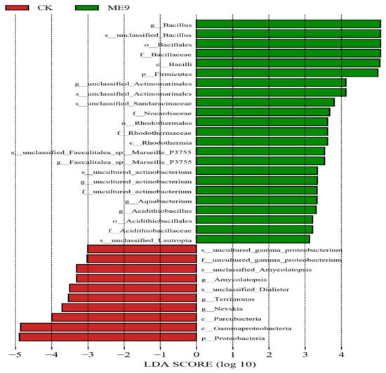 After comparing the microbial communities to identify the specialized bacterial groups after spraying with ME9 or not and characterizing the microbial diversities, the bacterial community data were analyzed using LEfSe at different levels. These results can establish the statistical significance, biological consistency and effect-size estimation of predicted biomarkers [64]. In the experiment, the default logarithm LDA value 4.0 was taken as a fixed value. When the value was greater than 4, it indicated that the strain had significant differences and could be used as a marker strain (Figure 12). A total of 33 distinct bacterial groups were identified (Figure 13). At the phylum level, Firmicutes and Proteobacteria were labeled when ME9 was applied and not applied, respectively. At the genus level, the microflora after ME9 spraying was characterized by the presence of B.; there were no labeled strains in the samples that were not sprayed with ME9. These results indicated that ME9 can colonize cassava leaves.