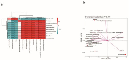 The influence of metabolites on microbial communities was checked after spraying ME9. In order to study the potential metabolic function of the dominant flora inoculated with ME9, a correlation analysis was conducted between its metabolic pathways and the dominant phyla. It was found that among the top 10 most abundant phyla, Proteobacteria-related pathways showed a significantly negative correlation compared with other pathways, and only the lipid metabolism and signal conversion pathways were positively correlated with them (Figure 14a). Through RDA redundancy analysis, it was found that Firmicutes showed a significant positive correlation with other phyla in the glucose metabolism pathway. The Proteobacteria showed a significant negative correlation (Figure 14b).