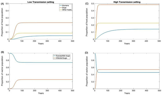 For our high and low prevalence settings, the endemic prevalence was estimated to be 0.54 and 0.26 for triatomine, 0.48 and 0.23 for dogs, 0.22 and 0.08 for other hosts, and 0.14 and 0.05 for humans, respectively. These estimates are consistent with empirical estimates from the tropics [54,55,56,57,58]. To initialize our simulations at endemic prevalence in each transmission setting, our model was run long enough to reach equilibrium (Figure 2).