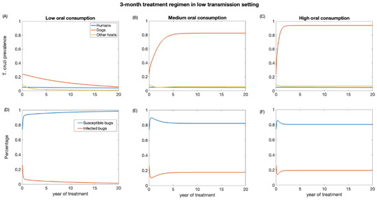 Impact of systemic insecticide treatment of dogs with fluralaner for the control of Chagas disease in low transmission setting with a 3-month regimen under different levels of dog consumption of dead triatomines. (A,D) Low oral consumption, (B,E) medium oral consumption, and (C,F) high oral consumption.