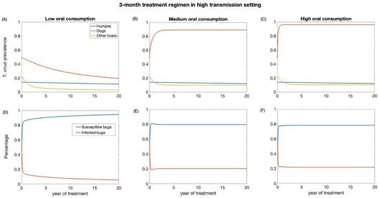 Impact of systemic insecticide treatment of dogs with fluralaner for the control of Chagas disease in high transmission setting with a 3-month regimen under different levels of dog consumption of dead triatomines. (A,D) Low oral consumption, (B,E) medium oral consumption, and (C,F) high oral consumption.