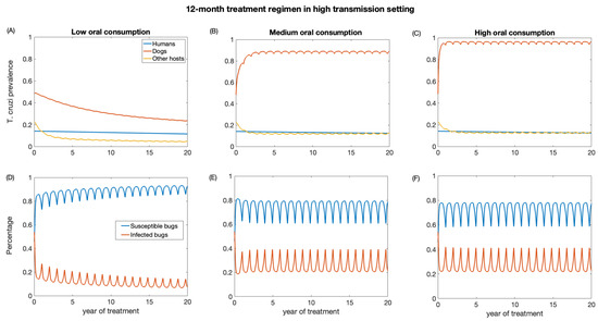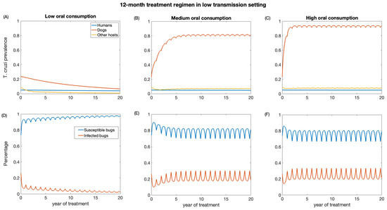 Impact of systemic insecticide treatment of dogs with fluralaner for the control of Chagas disease in low transmission setting with a 12-month regimen under different levels of dog consumption of dead triatomines. (A,D) Low oral consumption, (B,E) medium oral consumption, and (C,F) high oral consumption.