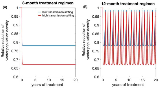 In all transmission settings, we observed a prompt decline in vector population density following the initiation of treatment for both regimens (Figure 7). Under the 3-month treatment regimen, the triatomines population was reduced and maintained to 67% of its pre-intervention level in high transmission settings and 79% in low transmission settings (Figure 7A). Under a 12-month regimen, the triatomine population was shown to be initially reduced to 67% of its pre-intervention level in high transmission setting and 79% in low transmission setting after each round of treatment (Figure 7B). However, the triatomine population was shown to recover promptly as fluralaner efficacy wanes (Figure 7B).