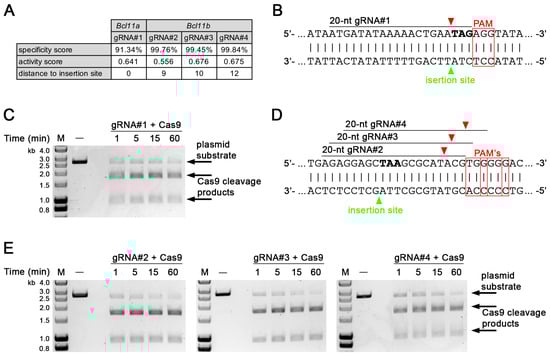 Similar results were obtained for gRNA#2, -#3, and -#4, inducing double-strand breaks close to the stop codon of Bcl11b (Figure 1D,E; full gels in Supplementary Materials, Figures S2–S4). In addition, we generated four gRNAs (gRNA#5, -#6, -#7, and -#8) targeting the 5′ end of the protein coding region of Bcl11b (Supplementary Materials, Figure S5A) that could be used for N-terminal tag integration and were also tested using an in vitro endonuclease activity assay. Our results show, that all gRNAs except for gRNA#8 efficiently cleaved a plasmid substrate containing the target sites (Supplementary Material, Figure S5B,C; full gels in Supplementary Materials, Figures S6–S9).