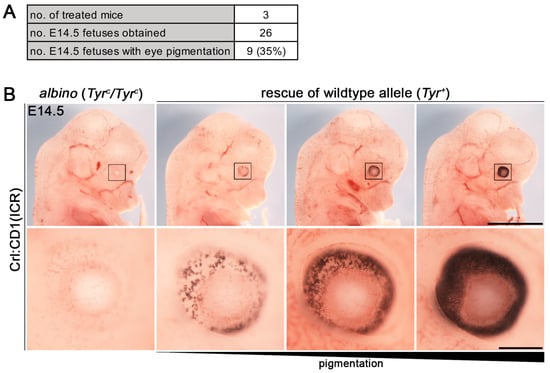 Rescue of Tyr+ allele in CD1 mice using the i-GONAD method. (A) Genome editing efficiency of the Tyr locus using the i-GONAD method. (B) Representative fetuses of E14.5 litter treated with gRNA targeting the Tyr gene and a ssODN restoring the wild-type allele (Tyr+) in albino (Tyrc/Tyrc) CD1 mice. Fetus on the left have non-pigmented eyes and fetuses on the right have increasing eye pigmentation. Lower panels represent enlargements of boxed regions in upper panels. Scale bars: 1 mm ((B), upper panel), 100 µm ((B), lower panel).