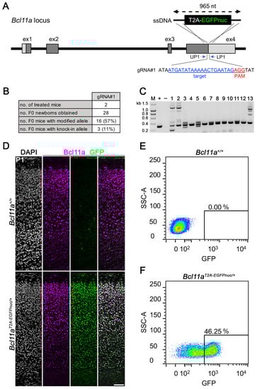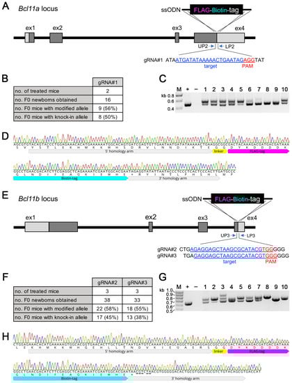 The following supporting information can be downloaded at: https://www.mdpi.com/article/10.3390/biology12091236/s1, Figure S1: Full DNA gel image of endonuclease activity assay of Cas9 and gRNA#1 (related to Figure 1C); Figure S2: Full DNA gel image of endonuclease activity assay of Cas9 and gRNA#2 (related to Figure 1E); Figure S3: Full DNA gel image of endonuclease activity assay of Cas9 and gRNA#3 (related to Figure 1E); Figure S4: Full DNA gel image of endonuclease activity assay of Cas9 and gRNA#4 (related to Figure 1E); Figure S5: Validation of candidate gRNAs targeting the 5′ end of the coding region of Bcl11b; Figure S6: Full DNA gel image of endonuclease activity assay of Cas9 and gRNA#5 (related to Supplementary Materials, Figure S5C); Figure S7: Full DNA gel image of endonuclease activity assay of Cas9 and gRNA#6 (related to Supplementary Materials, Figure S5C); Figure S8: Full DNA gel image of endonuclease activity assay of Cas9 and gRNA#7 (related to Supplementary Materials, Figure S5C); Figure S9: Full DNA gel image of endonuclease activity assay of Cas9 and gRNA#8 (related to Supplementary Materials, Figure S5C); Figure S10: Full DNA gel image of representative genotyping analysis of F0 generation with Bcl11aT2A-EGFPnuc allele (related to Figure 3C); Figure S11: Sequencing chromatogram of Bcl11aT2A-EGFPnuc allele (related to Figure 3); Figure S12: Full DNA gel image of representative genotyping analysis of F0 generation with Bcl11aFLBIO allele (related to Figure 4C); Figure S13: Full DNA gel image of representative genotyping analysis of F0 generation with Bcl11bFLBIO allele (related to Figure 4G); Figure S14: Generation of Bcl11bFLBIO/+ mice expressed N-terminally FLBIO-tagged Bcl11b; Figure S15: Full DNA gel image of representative genotyping analysis of F0 generation with N-terminally FLBIO-tagged Bcl11b (related to Supplementary Materials, Figure S14C); Figure S16: Full Western blot images of biotinylated FLBIO-tagged Bcl11a (related to Figure 5C); Figure S17: Full Western blot images of biotinylated FLBIO-tagged Bcl11b (related to Figure 5D).Table S1: Nucleotide sequences of gRNAs; Table S2: Nucleotide sequences of ssODNs; Table S3: Nucleotide sequence of plasmid for generating ssDNA; Table S4: Nucleotide sequences of genotyping primers.