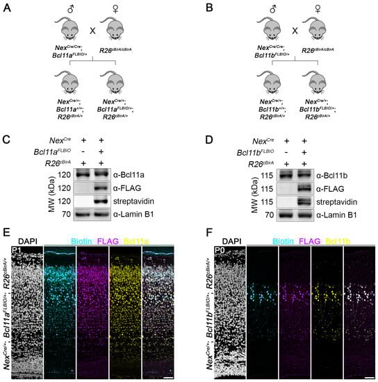 In order to analyze whether the C-terminally FLBIO-tagged Bcl11a and Bcl11b proteins are efficiently biotinylated in vivo, we applied the R26cBirA allele [25], from which bacterial biotin ligase BirA is expressed under the control of a CAG promoter in a Cre-dependent manner. Upon crossing these mice to mice expressing cell-type-specific Cre recombinase, BirA is expressed and subsequently biotinylates FLBIO-tagged Bcl11a or Bcl11b. We used NexCre mouse line [24] to generate mice expressing BirA in glutamatergic projection neurons of the dorsal forebrain (Figure 5A,B). Western blot analysis of nuclear lysates prepared from early postnatal brain tissue confirmed that Bcl11a and Bcl11b are specifically biotinylated in vivo only when BirA is expressed and the FLBIO tag is present. Moreover, signal intensity of FLBIO-tagged Bcl11a and Bcl11b proteins was similar in heterozygous animals (NexCre/+; Bcl11aFLBIO/+; R26cBirA/+ and NexCre/+; Bcl11bFLBIO/+; R26cBirA/+) in comparison to control littermates (NexCre/+; Bcl11a+/+; R26cBirA/+ and NexCre/+; Bcl11b+/+; R26cBirA/+), suggesting similar expression levels from the genome-edited alleles (Figure 5C,D; full blots in Supplementary Materials, Figures S16 and S17).