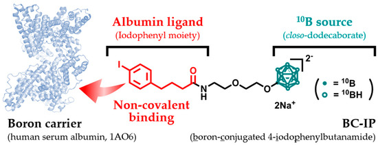 In the continued pursuit of enhancing the therapeutic potential of BNCT and reducing the total injection dose, attention has been focused on the use of small-molecule albumin ligands [11]. Our strategy is designed to form an albumin-boron conjugate post-injection in the blood, rather than preparing it pre-administration. In this context, boron-conjugated 4-iodophenylbutanamide (BC-IP) is a promising candidate [12].