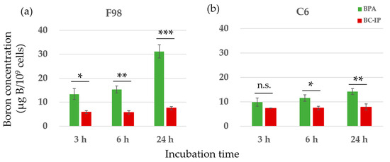 Intracellular uptake of boron was evaluated using F98 and C6 glioma cells. A total of 4 × 105 cells were plated in a 100-mm dish (Becton, Dickinson, and Company, Franklin Lakes, NJ, USA) and cultured for three days until they reached near-confluency. The culture medium was then replaced with fresh medium containing either 10 µg B/mL of BPA or BC-IP. The cells were subsequently incubated for an additional 3, 6, and 24 h at 37 °C. For boron retention studies, the cells were treated with 10 µg B/mL of BPA or BC-IP for 24 h, after which the medium was replaced with a boron-free medium and incubated for further 1, 3, 6, or 24 h. Following incubation, the cells were rinsed twice with cold phosphate-buffered saline (PBS). Subsequently, we detached the cells using trypsin-ethylenediamine tetra-acetic acid solution. The cells were collected by centrifugation at 200× g for 5 min and washed with cold PBS. This procedure was performed twice in order to remove boron attached to the cell membrane. The cells were then digested with 1 N nitric acid solution (FUJIFILM Wako Pure Chemical Industries, Osaka, Japan) overnight at room temperature. The boron concentration of the cell lysate was measured via inductively coupled plasma atomic emission spectroscopy (ICP-AES) (iCAP6300 emission spectrometer, Hitachi High-Technologies, Tokyo, Japan). The boron concentration within the cells was expressed as micrograms of boron (B) per 109 cells.