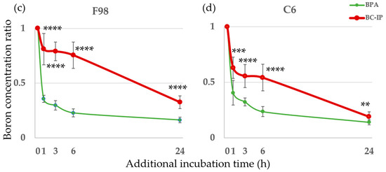 In vitro boron uptake and retention rates. (a,b) Boron concentrations in F98 and C6. Each cell line was exposed to 10 µg B/mL of BC-IP or BPA for 3, 6, and 24 h. Data is expressed in terms of mean ± standard deviation (SD). The boron concentration of BC-IP from 3 h to 24 h was significantly lower than that of BPA except in C6 at 3 h. n.s., not significant. (c,d) Each cell line was exposed to 10 µg B/mL BC-IP or BPA for 24 h and subsequently incubated with a boron-free medium for 1, 3, 6, and 24 h. The retention of boron in cells treated with BPA decreased rapidly, while that of cells treated with BC-IP decreased gradually. The boron retention rate of BC-IP from additional 1 to 24 h was significantly higher than that of BPA at the same time-point in both F98 and C6. * p < 0.05, ** p < 0.01, *** p < 0.001, **** p < 0.0001.