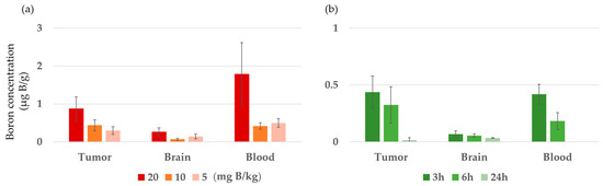 To assess the biodistribution of boron, the rats were implanted with 105 F98 glioma cells and treated with BC-IP at doses of 5, 10, or 20 mg boron (B) per kg body weight (b.w.) approximately 12–14 days post-implantation, a time window anticipated to allow tumor growth [9,15,16]. The animals were subsequently euthanized at predetermined time points (3, 6, or 24 h after intravenous (i.v.) BC-IP administration) and various tissue samples—namely tumor, brain, blood—were harvested and weighed. Each collected tissue sample was then processed by digestion in a 1N nitric acid solution for 1 week, followed by boron quantification using ICP-AES. The boron concentrations obtained from these assays are expressed as micrograms of boron (B) per gram of tissue.