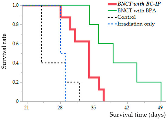 Although the BNCT with BC-IP group had a significantly shorter survival extension than the BNCT with BPA group (p = 0.016, according to the log-rank test), they had a significantly longer survival extension than the untreated control and irradiation-only group (compared to the control group, p = 0.0086; compared to the irradiation-only group, p = 0.019, respectively, log-rank test) (Figure 4).