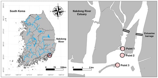 The Nakdong River is the second largest river system in South Korea and maintains a well-developed estuarine system (35°05′ N, 128°55′ E). It is also recognised as an important biodiversity conservation area, including winter bird habitats and stopover sites on the East Asia–Australasian Flyway [24]. Another important feature of the estuary is its flood control activities, primarily through an estuarine barrage built in 1987 which divides brackish areas into distinct freshwater and saline zones. This division is believed to influence biodiversity changes [23], necessitating thorough and efficient monitoring methods to address growing concerns regarding regional biodiversity protection. In the present study, we selected three points within the brackish area with different salinity levels (Figure 1). Points 1, 2, and 3 were located approximately 2.0 km, 2.7 km, and 3.9 km from the estuarine barrage, respectively. C. fluminea is widely distributed in this area, as they have been continuously released for fishery resources by the Busan Marine Fisheries Resources Research Institute [25].