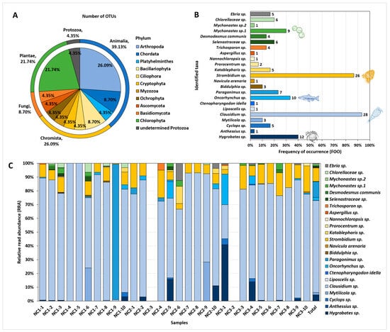 Overall taxa composition detected from the gut contents of C. fluminea (n = 30). Each colour sector represents a different kingdom group (blue: Animalia, yellow: Chromista, orange: Fungi, green: Plantae, grey: Protozoa). (A) The number of OTUs represented as a proportion based on each phylum and kingdom group. (B) Frequency of occurrence (FOO) for each OTUs. The number at the edge of the bars refers to the number of C. fluminea samples in which the taxon detected. (C) Relative read abundance (RRA) for each OTU. The sample name represents each of the 10 samples collected from three different sampling points.