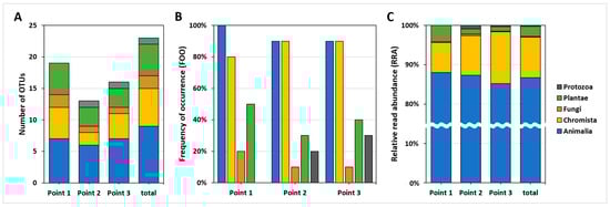 In the comparison of number of OTUs, RRA, and FOO, no marked difference was observed between the three sampling points (10 samples per sampling point). The Points 1, 2 and 3 included 19 OTUs (11 phyla, 4 kingdoms), 13 OTUs (8 phyla, 5 kingdoms), 16 OTUs (10 phyla, 5 kingdoms) of the total 23 OTUs, respectively (Figure 3A). At all sampling points, the kingdom Animaila accounted for ≥90% FOO and ≥85% RRA, whereas Chromista accounted for ≥80% FOO and ≥7% RRA (Figure 3B,C). Based on PERMANOVA, the three sampling points did not exhibit significant differences in their RRA data of total 23 taxa (Table A2; p > 0.05), suggesting that the composition of taxa detected from the C. fluminea gut contents was not different across the sampling points.