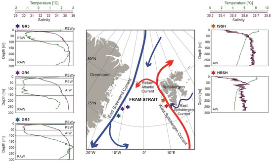 Map of Fram Strait with main ocean currents and sampling stations. Plots show changes in temperature and salinity at each sampling station and the classification of water masses based on Cottier et al. [38] and Rudels et al. [39]: Polar Surface Water warm (PSWw), Polar Surface Water (PSW), Re-circulating Atlantic Water (RAW), Arctic Intermediate Water (AIW), and Atlantic Water (AW). The map was created using ArcGIS 10.7.