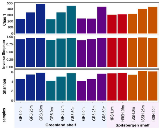 Alpha diversity indices: Chao1, Inverse Simpson, and Shannon of microbial communities present in the Greenland and Spitsbergen shelves.