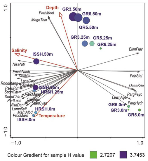 To study the relationship between abiotic environmental variables (water temperature and salinity, as well as sampling layer), stations’ localization, and microbial community, constrained ordination techniques were applied in CANOCO 5 [56]. The results of a preliminary de-trended correspondence analysis (DCA), based on the length of the main gradient, pointed to a redundancy analysis (RDA) as the most appropriate analysis procedure; thus, we decided to use this analysis. The OTU abundance data were transformed [n’ = log (n + 1)] prior to further analyses, while the environmental variables were ranked, according to their quantitative importance, by manual selection based on the Monte Carlo permutation test adjusted for temporal autocorrelation [56].
