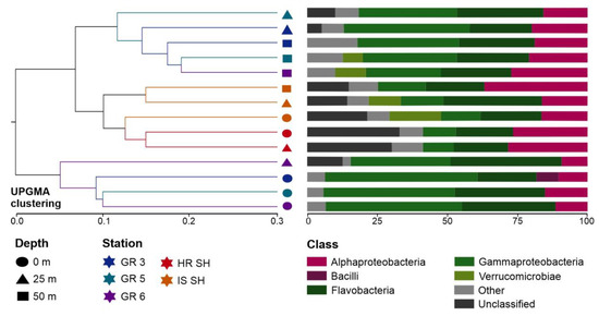 A similar distribution of samples can be seen in the plot illustrating UPGMA sample clustering based on the UniFrac distance (Figure 4), which measures the dissimilarity between samples based on the lineages they contain [63]. Bacterial communities from the Greenland and Spitsbergen shelves were divided into two main clades. One of these distinct clades consisted of all surface samples from the Greenland shelf and one sample from this region from the 25 m depth. The second clade consisted of two subclades, i.e., one grouped all samples from the Spitsbergen shelf, and the second subclade grouped samples collected from 25 m and 50 m in the Greenland shelf region. Overall, the dissimilarity was lower between deeper samples from the Greenland shelf and all samples from the Spitsbergen shelf than the surface vs. deeper samples collected from the Greenland shelf. Flavobacteria, Alphaproteobacteria, and Gammaproteobacteria were the most abundant class of bacteria in all samples. Computed differences between microbial communities based on the phylogenetic distance between them showed that samples collected from the Spitsbergen shelf contained more unclassified sequences (Figure 4).