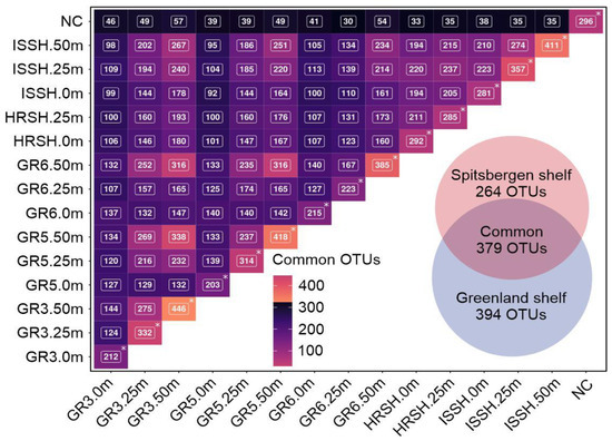 The matrix showing the number of common OTUs for the Greenland and Spitsbergen shelves with a Venn diagram illustrating the core and specific seawater microbiome OTUs of all samples. Asterisks indicate the total number of identified OTUs per sample.