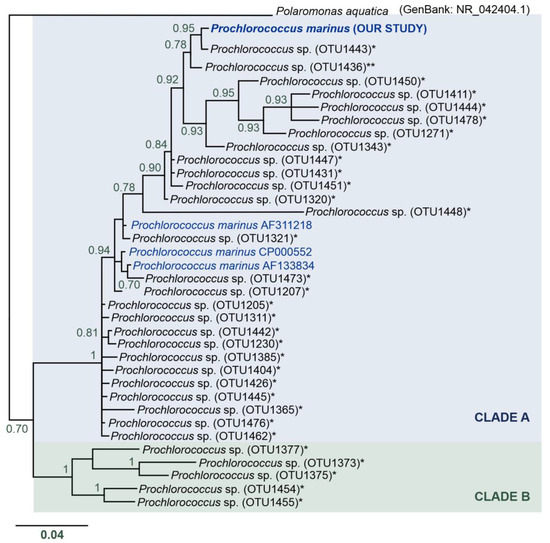 Phylogenetic reconstruction of the Prochlorococcus marinus identified in our study—BI analysis topology. Nodes with pp < 70 were collapsed. Clade A is indicated in blue, and Clade B in green. Asterisks (*) indicate 16S rRNA sequences of OTUs of the genus Prochlorococcus from the study of Sunagawa et al. [12]; double asterisk (**) indicates Prochlorococcus OTU found in the Antarctic Province. Sequences downloaded from GenBank are marked in blue.