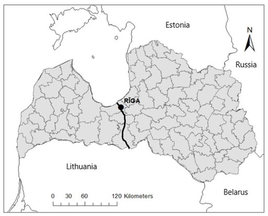 Material and data for this study were collected throughout the entire territory of Latvia, which occupies 64.6 thousand km2 along the eastern coast of the Baltic Sea. Wolves are distributed and harvested in the whole country with the exception of the territory around the capital Riga. Approximately 50% of the region is covered with mainly mixed boreal forests. A hunting season from 15 July to 31 March and an annual hunting quota were introduced in Latvia in 2004. The quota is set annually for the whole country. It has been increasing since 2004 and was around 270–300 animals for the last ten hunting seasons. Official census data in the last decade have estimated the number of wolves in Latvia to be around 1200 individuals, while Virtual Population Analyses estimates of minimum wolf abundance for the same period were around 700–800 individuals. Hunting mortality was estimated to be about 37% in the last two decades [30]. Wolves are hunted both during specially organized hunts and also during hunts of other game animals, and wolf hunting in Latvia can be considered nonselective. The main prey species for wolves are wild ungulates, mostly roe deer (Capreolus capreolus) and wild boar (Sus scrofa), and prey availability during the study period was not a limiting factor for the population [29].