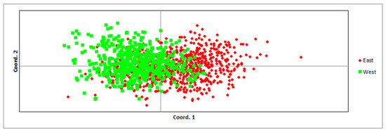 Comparing the eastern and western parts of the populations, the average expected and observed heterozygosity did not differ significantly: 0.737 ± 0.019 and 0.722 ± 0.020 in the east and 0.706 ± 0.018 and 0.700 ± 0.022 in the west, respectively. Allelic diversity was also not significantly different between both parts of the population (in the east—8.15 and in the west—7.74; t(30) = 0.51, p = 0.611). Comparing the genetic distance between individuals in both regions, some differentiation was observed (Figure 2), but the eastern and western parts of the populations were not genetically differentiated (Fst = 0.019, p = 0.001). Inbreeding coefficients in both parts of the populations were low: 0.020 ± 0.008 in the east and 0.010 ± 0.008 in the west. Thirteen migrants per generation were estimated between the eastern and western regions. Significant differences in mean pairwise relatedness were found: in the western region, it was higher (0.048 ± 0.001) than in the eastern region (−0.001 ± 0.001).