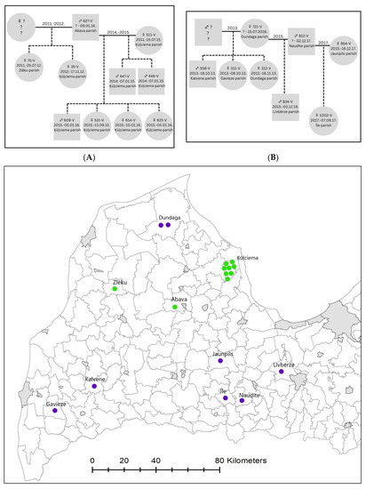 Relationships in two wolf packs in the western part of Latvia and hunting locations of the individuals (pack (A) in green; pack (B) in purple). Continuous lines mark breeding pairs; years above the line indicate estimated time period of breeding pair relationship. Dotted lines mark offspring. Number of the sample, year of birth, and date and place of harvest are shown for every wolf. The “?” marks unknown individuals that were not sampled or indicates information about the sampled individuals was missing.