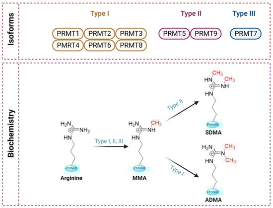 A schematic representation of PRMTs isoforms and their role in arginine methylation. There are three types of PRMTs responsible for conversion of arginine to monomethyl arginine (MMA). Further generation of symmetrical dimethylarginine (SDMA) is catalyzed by type II PMRTs, while formation of asymmetrical dimethylarginine (ADMA) is catalyzed by type I PMRTs (Created with BioRender.com, accessed on 11 August 2023).