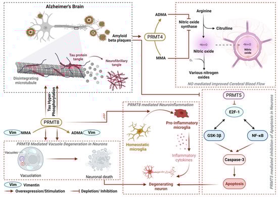 Intricated role of PRMTs in Alzheimer’s Disease pathology. ADMA formation via PRMT4 binds to nitric oxide synthase (NOS) as a non-canonical ligand and inhibits NOS function while reducing cerebral blood flow, an important parameter for normal brain functions. Accumulation of amyloid beta leads to depletion of PRMT5 and potentiates neuronal apoptosis, further enhancing neuronal degeneration. Overexpression of PRMT8 leads to tau hyperphosphorylation, neuroinflammation and vacuole degeneration in neurons (Created with BioRender.com, accessed on 11 August 2023).