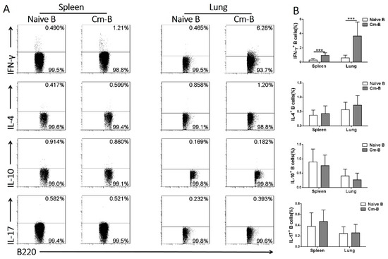 Cm-B cells produced higher levels of IFNγ than naïve B cells in both the spleen and lung. Mice were infected with Cm intranasally and were sacrificed on day 10 post-infection. (A) Intracellular cytokines of CD3−B220+ cells (B cells) from naïve and infected mice in the spleen and lung. (B) Summary data are shown as the mean ± SD of each group. The experiment was repeated more than three times. Each group included three or more mice in each repeating experiment. The data shown are Mean ± SD. *** p < 0.001.