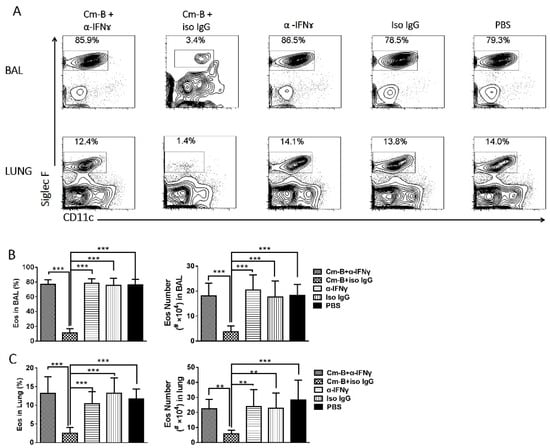 Flow cytometric analysis of eosinophilic responses in the lung tissues and BAL fluids following Cm-B cell transfer and anti-IFNγ antibody treatment. Mice were treated as described in Figure 5. (A) Single cells in BAL fluids and digested lung tissues were analyzed by flow cytometry. Cells were gated for live cells, and CD45+ cells and the CD11c-Siglec F+ cells were defined as eosinophils. The percentage (left) and the absolute number (right) of eosinophils in the BAL (B) and the lung (C) were shown as the mean ± SD of each group. The experiment was repeated more than three times. Each group included three or more mice in each repeating experiment. The data shown are Mean ± SD. ** p < 0.01; *** p < 0.001.