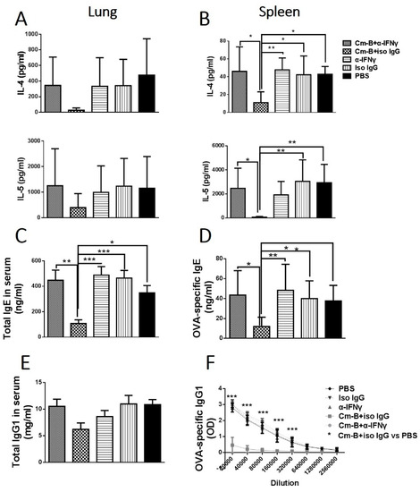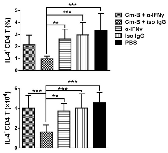 3.5. The Inhibitory Effect of Cm-B Cells on Allergen-Driven Th2-Related Cytokines and Antibodies Was Abolished by co-Administration of anti-IFNγ mAb