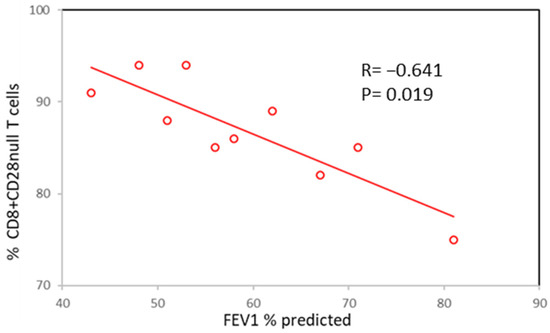 Negative correlation between FEV1 and the percentage of small airway CD28nullCD8+ T cells in patients with COPD.