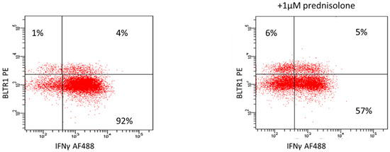 The effects of 1 µM prednisolone compared with medium alone on upregulation of BLTR1 expression by CD28nullCD8+ T and NKT-like cells are shown in Figure 2. In the presence of 1 µM prednisolone, there was a significant upregulation of BLTR1 (p < 0.05) and a significant inhibition of IFNγ (p < 0.05).