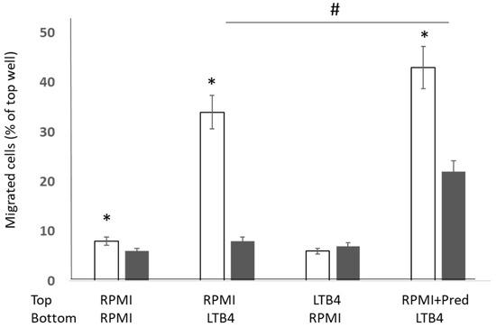 Graph showing the percentage of migrated cells through a 5 µM filter (CD28+CD8+ T cells: clear bars; CD28nullCD8+ T cells: grey bars) in response to ± RPMI ±10 nM LTB4 ± µM prednisolone. There was a significant decrease in the random migration of CD28nullCD8+ T in cells suspended in RPMI from the top of the filter with RPMI on the bottom chamber (p < 0.05). There was a significant increase in CD28+CD8+ T cells migrating through the filter in response to 10 nM LTB4 in the bottom chamber (p < 0.05) but no change in CD28nullCD8+ T cell migration. There was no change in the percentage of CD28null and CD28+ T and NKT-like cells migrating through the filter with cells suspended in RPMI+10 nM LTB4 on the top of the filter with RPMI in the bottom chamber. There was a significant increase in both CD28null and CD28+ T and NKT-like cells migrating through the filter when cells were incubated with 1 µM prednisolone +RPMI on the top filter with 10 nM LTB4 in RPMI in the bottom chamber. There was a significant increase in percentage of CD28+ T cells migrating through the filter compared with CD28null cells. There was a significant increase in CD28nullCD8+ T cells migrating through the filter in the presence of 1 µM prednisolone compared with RPMI alone (#) (p < 0.05). “*”: p < 0.05.