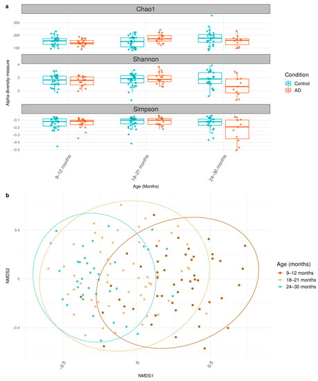 To determine gut microbial diversity of each sample, alpha diversity indices (Chao1, Shannon, and Simpson) were calculated using 16S rRNA genes data and compared between control and AD groups using linear modelling (Figure 1a, Supplementary Table S2). Chao1, Shannon, and Simpson indices did not display any statistically significant shifts in microbial diversity across all time points (9–30 months) in both control and AD groups (Supplementary Table S2). Previous studies, such as Lee et al. (2022) and Ismail et al. (2012) [18,38], reported a decrease of bacterial diversity among AD infants in their respective studies. Notably, our findings did not show those observations (Figure 1a).