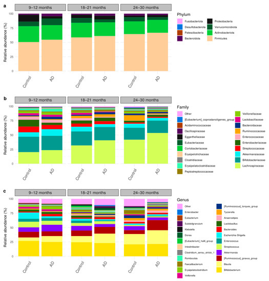 Taxonomic compositions of all participants in the control and AD groups were classified into 8 phyla, 70 families, and 199 genera, as shown in Figure 2. The three major prevalent phyla, based on their relative abundance, were Firmicutes (56%), Actinobacteriota (28%), and Proteobacteria (5%). Interestingly, these phyla were dominated by single families, namely Lachnospiraceae (32%), Bifidobacteriaceae (27%), and Enterobacteriaceae (5%), respectively. These taxonomic abundances are similar to the gut microbiome composition among Asian children [29,39]. As shown in the relative abundance over the time (Figure 2), Firmicutes increased, while Actinobacteriota and Proteobacteria decreased in both control and AD groups, which is in agreement with typical gut microbiome progression in healthy children [39,40].