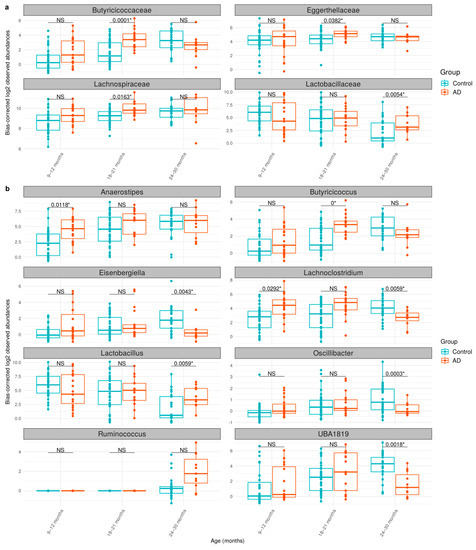 Cross-sectional analysis between control and AD groups is shown in Figure 3, which displays the significantly different bacterial communities at the family and genus levels between the control and AD groups at different time points (Figure 3a,b). At ages of 9–12 months, Anaerostipes and Lachnoclostridium were over-represented in the AD group. At ages of 18–21 months, Butyricicoccaceae, Eggerthellaceae, Lachnospiraceae, and Butyricicoccus were more abundant in the AD group. At the age of 24–30 months, Lactobacillus was shown to be higher in the AD group, while Eisenbergiella, Oscillibacter, Lachnoclostridium, or UBA1819 were found to be enriched in the control group. As shown in Table 3 and Supplementary Table S5, the increasing abundance of Oscillibacter was notably found at 24–30 months, indicating a cross-sectional variation occurrence as described in other studies, of which Oscillibacter was enriched in non-AD in early childhood [18,47], although its purpose was unclear. In our study, Lachnoclostridium also exhibited an interesting pattern upon cross-sectional variation (Figure 3 and Table 3), where it was significantly enriched in the control group at 24–30 months. Lachnoclostridium were characterized with lipid metabolism and influence on SCFAs level [48], but its effects on AD pathogenesis have yet been described.