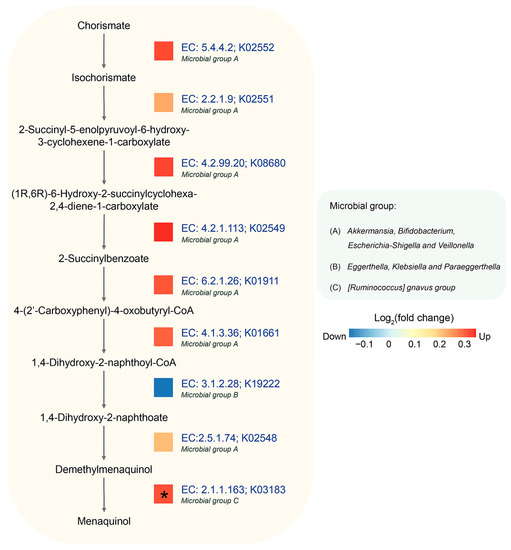Longitudinal difference in abundance between control and AD groups in menaquinol biosynthesis using PICRUSt2. Log2 (fold change) of predicted gene abundance is visualized. The predominant microbial groups with relevant KO IDs and EC numbers were predicted by PICRUSt2. An asterisk (*) indicates a statistically significant difference in abundance based on reported metaproteomic data (Kingkaw et al., 2020 [27]).